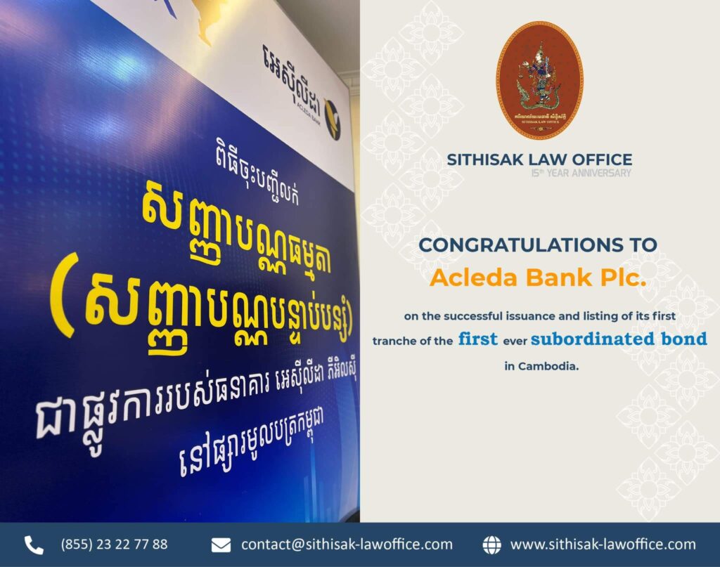 Sithisak Law Office is pleased to have served as legal counsel for ACLEDA Bank Plc’s first subordinated bond issuance, the first transaction of its kind in Cambodia. The initial tranche successfully raised 343.35 billion riels (approximately USD 85.5 million), with the second tranche planned to bring the total issuance to around 400 billion riels (approximately USD 100 million).