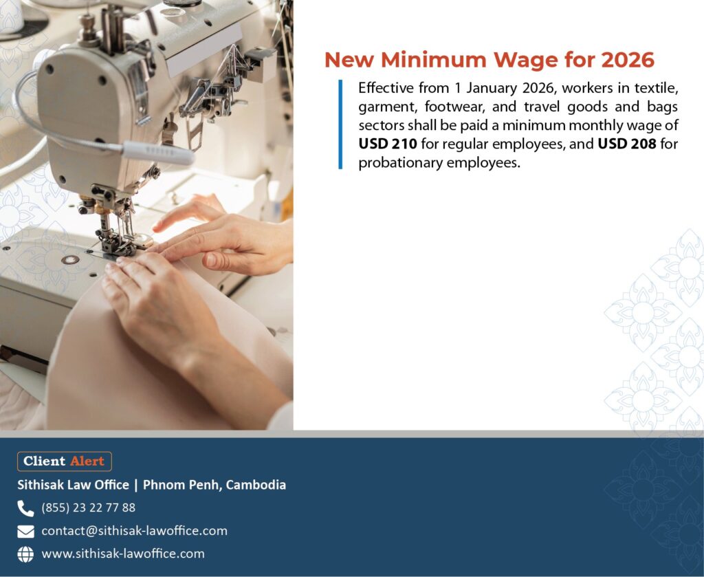 Effective from 1 January 2026, workers in the textile, garment, footwear, and travel goods and bags sectors shall be paid a minimum monthly wage of USD 210 for regular employees and USD 208 for probationary employees.