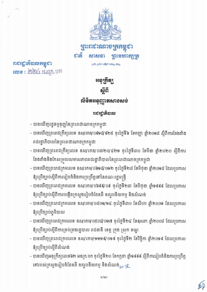 Sub-Decree No. 224 HNK.BK composes of 12 chapters and 54 articles which aims to determine the competence, conditions and procedure for granting construction permit, construction reparation permit, demolition permit, construction site opening permit and the renewal of those permits under the supervision of the Ministry of Land Management, Urban Planning and Construction. This Sub-decree applies to all types of construction except for the types of construction that are governed by separate legal instruments.