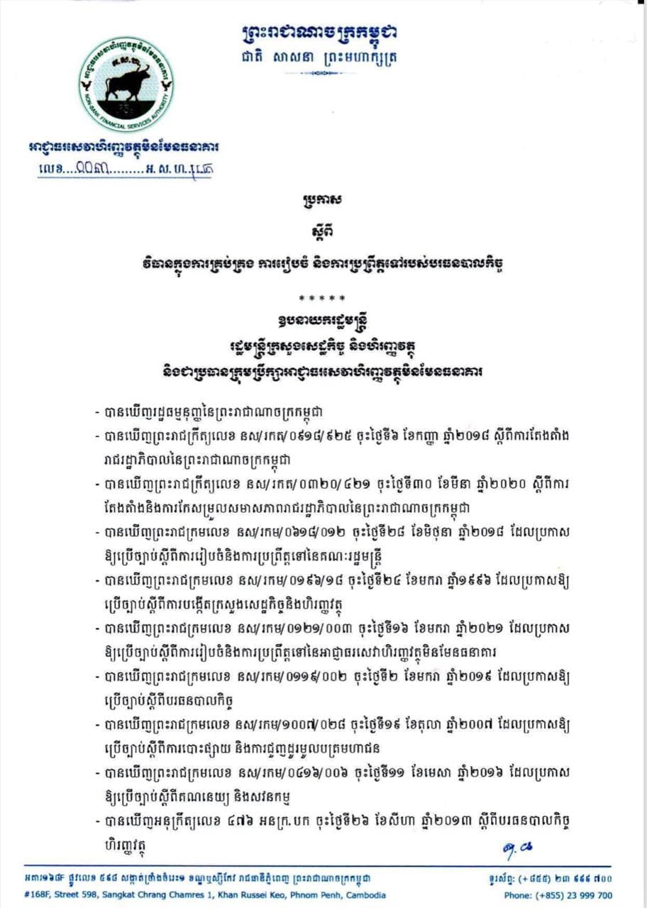 On April 12th, 2024, the Securities and Exchange Regulator of Cambodia (SERC) had issued a notification to the public on the implementation of Prakas No. 027 dated April 05th, 2024 on the requirements for financial soundness of company operating collective investment scheme business issued by the Non-Bank Financial Services Authority for the purpose of managing and monitoring the financial soundness of the Fund Management company, Fund Custodian Company, Fund Distributor Company, and Fund Administrator Company with efficiency, transparency, accountability, good order and arrangement.