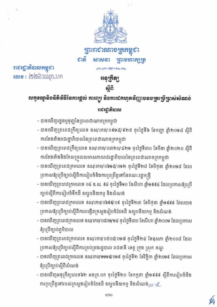 On 30 December 2020, Royal Government of Cambodia issued a Sub-decree No.226 HNK.BK on the conditions and procedures for granting, suspending and revoking certificate of occupancy which composes of 13 chapters and 55 articles (“Sub-decree No.226 HNK.BK”) under the supervision of the Ministry of Land Management, Urban Planning and Construction.