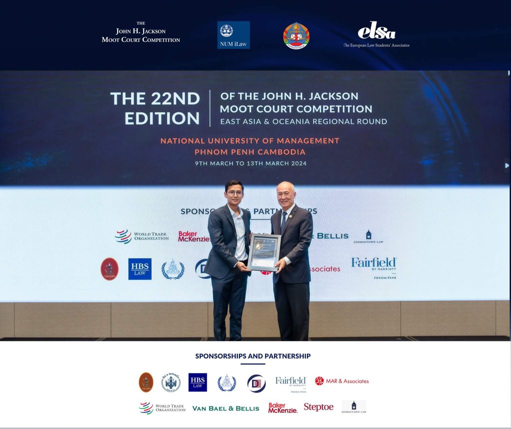At Sithisak Law Office, we are proud to play an active role in nurturing the next generation of legal professionals and promoting academic excellence in the field of international trade law. As part of our continuing commitment to legal education, we were honored to serve as a sponsorship partner of the East Asia & Oceania Regional Round of the 22nd John H. Jackson Moot Court Competition (JHJMCC), hosted by the National University of Management (NUM) from 9–13 March 2024 in Phnom Penh.
