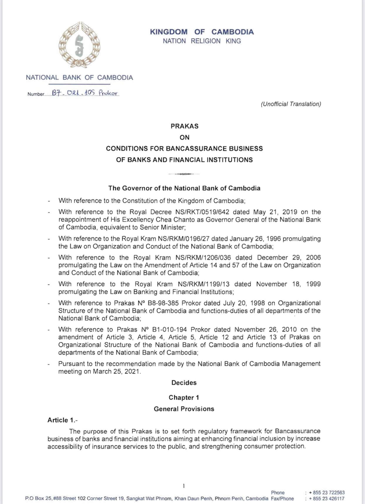 Legal Update: Prakas on Conditions for Bancassurance Business of Banks and Financial Institutions